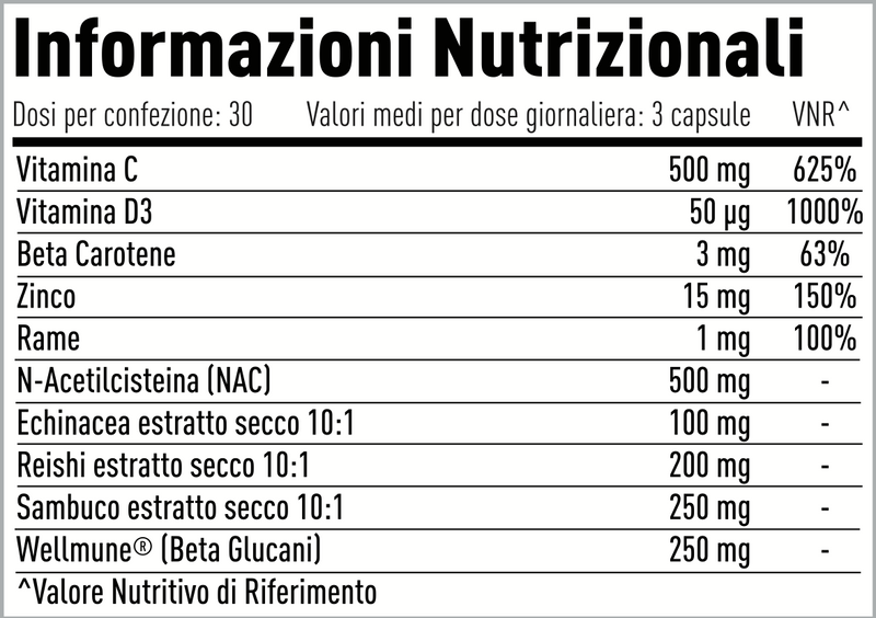 Integratore completo e naturale con Wellmune®, vitamine C e D3, zinco, rame, sambuco, echinacea e reishi.