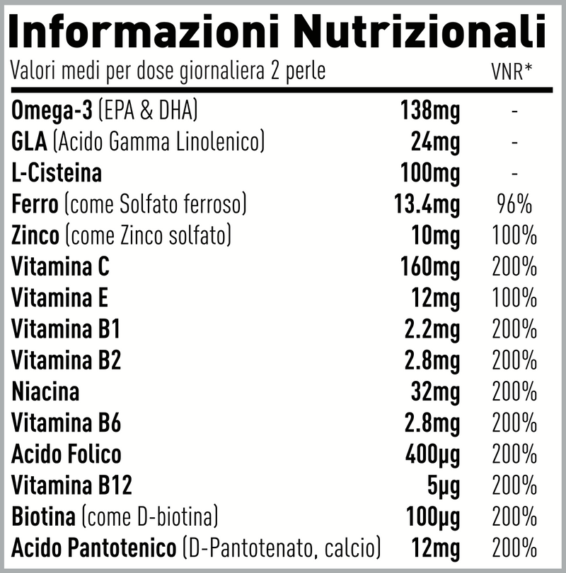 Omega-3 da olio di pesce distillato, capsula [gelatina bovina, umidificante (glicerina), colorante (ossido di ferro)], Acido ascorbico (Vit. C), Olio di Boragine (GLA), L-Cisteina, lecitina di soia, Solfato ferroso, Nicotinamide (Niacina), colorante (cera d’api), Zinco solfato, dl-alfatocoferolo acetato (Vit. E), D-calcio pantotenato (Acido pantotenico), magnesio ossido, Cianocobalamina (Vit. B12), Piridossina cloroidrato (Vit. B6), Riboflavina (Vit. B2), Tiamina mononitrato (Vit. B1), Acido folico, Biotina.