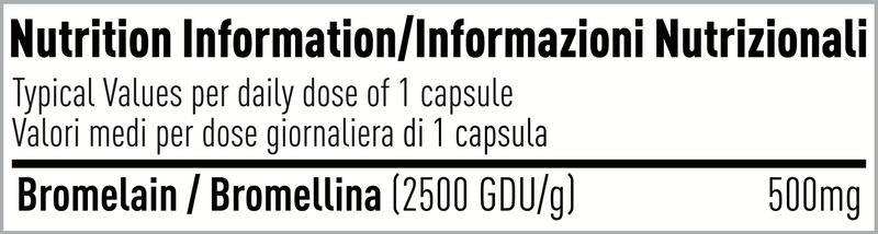 Bromelina 2500 GDU/g (da estratto di Ananas comosus (L.) Merr., gambo), capsula vegetale (idrossi propilmetilcellulosa), agente ante-agglomerante (sali di magnesio degli acidi grassi), agente di carica (cellulosa microcristallina).