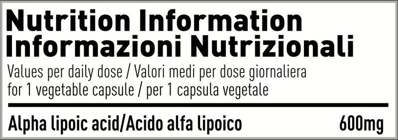 Acido Alfa Lipoico, capsula vegetale (agente di rivestimento: idrossipropilmetilcellulosa), agenti di carica (cellulosa), agenti anti agglomeranti (biossido di silicio, sali di magnesio degli acidi grassi).